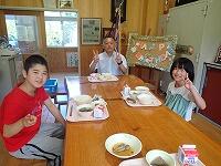 冷や汁は、魚のすり身にみそやごまを混ぜてだし汁や水でのばし、輪切りにしたきゅうり、豆腐、大葉などを加えてご飯にかけて食べる宮崎の郷土料理です。昔、農民が暑い夏に作業をするとき、時間や食欲のないときでも栄養補給や体力回復ができるようにと考えられ、伝えられてきた料理といわれています。今日の冷や汁にはあじのほぐし身を入れてあります。麦ご飯に冷たい冷や汁をかけていただきました。
