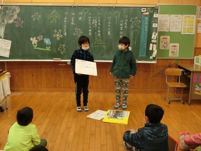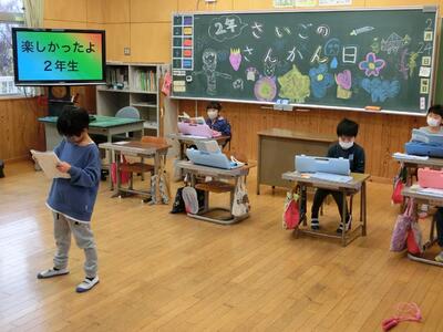 G授業で学んだことを発表したり、授業を通してできるようになったことや将来の夢を発表したりするなど、この1年間を振り返った内容で、どの学年もそれぞれ工夫がされていました。お家の方々に見ていただきながら、子ども達はみんな張り切って発表していました。