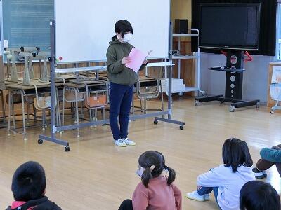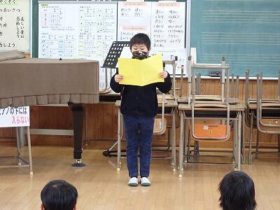 5年生の代表児童が3学期の目標として、「元気なあいさつ」「高学年としての責任ある行動」について発表しました。新しい年を迎えて、ますますがんばろうとする気持ちがよく伝わってくる発表でした。