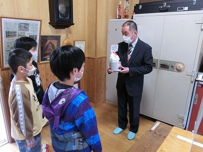 1月12日(木) 赤い羽根共同募金で集まった募金の受け渡し式が行われました。昼休みに五ヶ瀬町社会福祉協議会の方がいらっしゃって、校長室でみんなで集めた募金を代表児童が手渡しました。