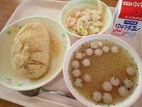 今日は、すっかり人気メニューになった「たこ焼き揚げ」の登場です。給食室にはたこ焼きを作る機械がないので、たこやちくわ、キャベツ、にんじんなどの野菜を小さく刻んで、小麦粉や卵でまとめて、ひとつひとつ手で丸めて油で揚げています。揚げた物にソースをからめてかつお節と青のりをふりかけています。普通のたこ焼きもおいしいですが、給食のたこ焼き揚げも、かりっとしていて、野菜たっぷりで、愛情がこもっていておいしかったです。