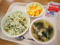 高菜チャーハン 牛乳 きのこスープ フルーツ杏仁