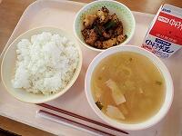 麦ごはん 牛乳 五目豆腐スープ 鶏肉とさつまいもの揚げ煮