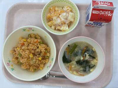 チキンライス 卵スープ フルーツヨーグルト 牛乳