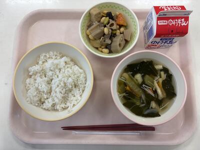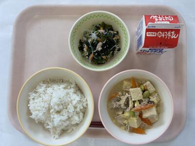 麦ごはん 高野豆腐の卵とじ わかめとツナの和え物 牛乳
