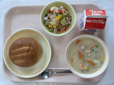 米粉パン サーモンチャウダー カラフルサラダ 牛乳