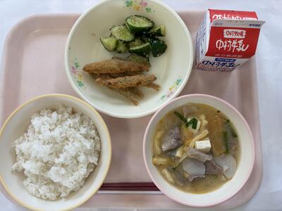 千切り茶めし ひじきスープ いわしとしいたけの変わり揚げ 牛乳
