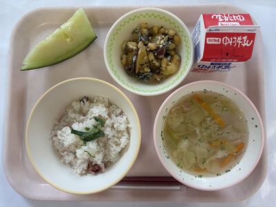 たこごはん キャベツスープ 大豆と小魚の揚げ煮 牛乳