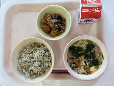 今日は、三ケ所小の茶畑で採れたお茶を使った混ぜご飯です。宮崎県産のちりめん、油揚げを使って風味のよいごはんです。