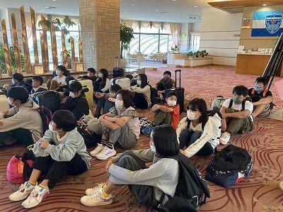 ホテル日南北郷リゾートに無事到着し、入館式を行いました。みんなとっても元気です。ホテルでの夕食や友達と部屋で過ごす時間が、とても楽しみなみんなです。