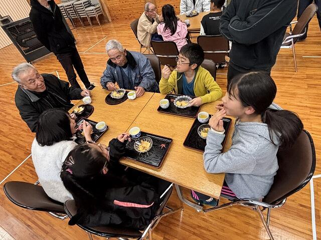 みんなで作った後は、鞍楽の方が用意してくださった牛乳もちとお茶をいただきながら、子どもたちと地域の方が楽しく話すことができました。昔の鞍岡小のことを聞いて、今との違いにびっくりする子もいました。