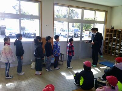 1月8日(木)本校には、週1回程度、下校前に全校児童が玄関ホールに集まって「下校の集い」を行っています。この日は、市町村対抗駅伝競走大会に出場する児童へエールを送りました。また、「食と農」壁新聞コンクールで五ヶ瀬町長賞に輝いた3年生6名への表彰も行われました。