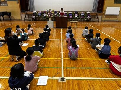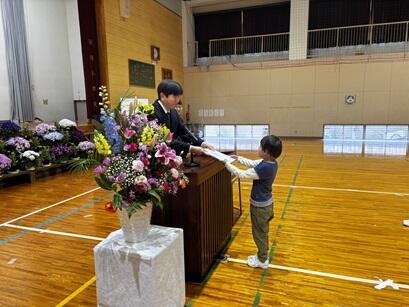 3月24日(火)修了式を行いました。各学年の代表児童が修了証を受け取った後、1年生の代表児童が作文発表をしました。また、放課後には、転校する児童2名にエールを送りました。