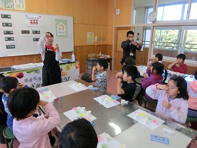 味の種類や目や鼻、耳などの五感を使って味を感じることの大切さについて教えていただきました。授業の中ではいろんな味を実際に目をつぶって感じる活動もあり、子ども達は口に入れると、「あまい~」「すっぱい!」など元気に答えていました。