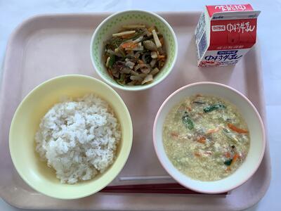 親子丼 茎わかめのきんぴら 牛乳