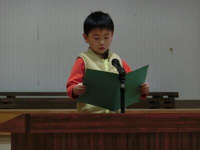1年生の代表児童が、1年間、漢字の練習やあいさつをがんばったことを発表しました。2年生でのさらなるがんばりがとても楽しみになる発表でした。堂々とした姿が立派でした。