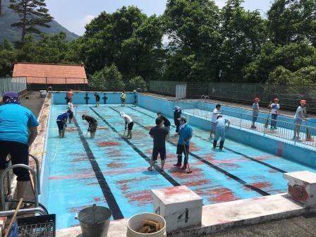 5月27日(金)に、プール掃除が行われました。最初は、鞍岡小教育振興会(PTA)の保健体育部のお父さん・お母さん方が中心となって、プール内の汚れ落としでした。こびりついた汚れを、みんな一生懸命こすって落としました。その後、1年生から6年生までの全児童も加わり、プールサイドから足・腰洗い場やシャワー部分まで、一斉に掃除をしました。大人も子どもも一丸となって、みんなでプールをきれいにしました。6月14日(火)のプール開きがとても楽しみです。保護者のみなさん、御協力ありがとうございました。