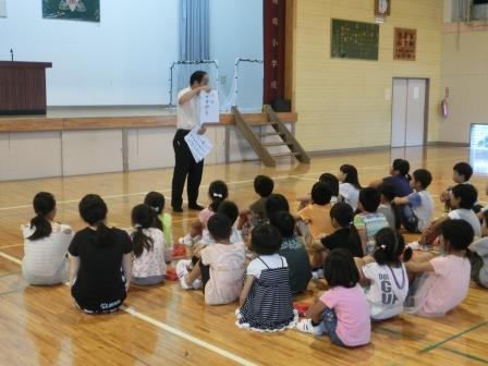 始業式の後、9月に行われる運動会結団式が行われました。今年の運動会のスローガンは、「あきらめないで 支え合おう みんなで笑顔になるために」です。はじめにこのスローガンを、5・6年生が発表した後、体育主任の先生からスローガンに込められた思いを話してもらいました。本年度の運動会には、地域・家庭・熊本へ元気を発信すること、五ヶ瀬町町政60周年の思いを表現すること、オリンピックイヤーにふさわしい会にすることなどがスローガンに込められているようです。みんなで盛り上げていきます。