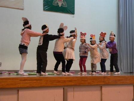 その後は、1年生「おとうとねずみチロ」、2年生「立ち向かう9人」の発表でした。1年生は、国語で学習した内容をもとに鞍岡バージョンに脚色して、劇や運動・音楽等でかわいらしく演じました。また、2年生は、今まで学んで成長してきたことを体をいっぱい動かして表現しました。困難なことにも負けずに学びに立ち向かってきた2年生の成長を感じました。