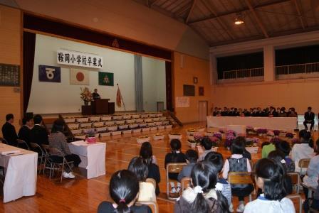 本年度の卒業生は、女子2名でした。二人は、この一年間、下級生をしっかりとリードし、鞍岡小学校を大いに盛り上げてくれました。伝統である鼓笛では、トランペットとマーチングキーボードの中心として活躍し、下級生への楽器指導にも力を発揮しました。また、運動会では、団長として、それぞれの団を率い、先頭に立って大成功へ導きました。後輩たちに慕われる6年生との別れは、下級生にとってとても悲しいものでしたが、式では、一生懸命呼びかけをしたり、大きな声で歌を歌ったりとがんばってくれました。また、6年生も、凛としたすばらしい姿を見せてくれました。思い出に残る感動的な卒業式となりました。