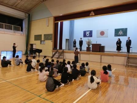 まずはじめに、鞍岡小に新しく来られた4名の先生方と全校児童との出会いの式(新任式)が、朝8時15分から体育館で行われました。子どもたちは期待に胸ふくらませて、4名の先生方を迎えました。大きな声であいさつをし、まず、鞍岡っ子の素晴らしさを先生方に示すことができました。その後、先生方からあいさつをいただき、児童を代表して新6年生の岩佐芽依さんが歓迎の言葉を発表しました。先生方もうれしそうに聞いていました。