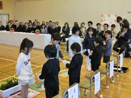 式では、元気よく返事をし、立派な態度でした。2年生の歓迎の言葉では、1年生の主な行事が紹介され、最後に、昨年育てたアサガオの種をプレゼントとしてもらいました。とてもうれしそうにしていました。