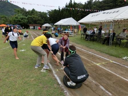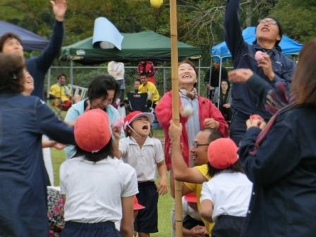保護者も負けてはいません。真剣勝負のリレーと和気あいあいあの団技、全保護者が参加して盛り上がっていました。6年生の親子団技は、いろいろな工夫が凝らしてあり、笑いの中にも家族の絆を会場のみんなで確かめ合うことができました。また、以前おられた先生方御家族も来ていただき、競技に参加したり、片付けを手伝ったりしてくださいました。来られた先生方も、子どもたちや保護者の方々もとても嬉しそうでした。