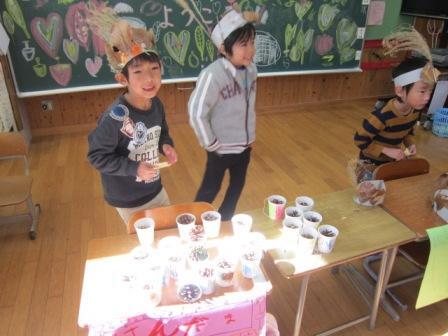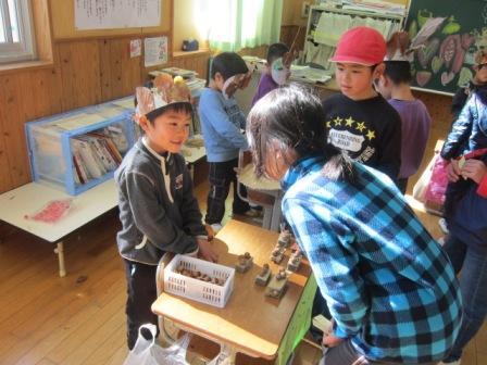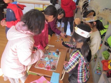今日の昼休みに、1年生が教室で秋祭りを行いました。秋の贈りものの落葉や松ぼっくり、ドングリなどで作った品物を並べて、お店屋さんになって上級生や先生方のお客さんに売りました。