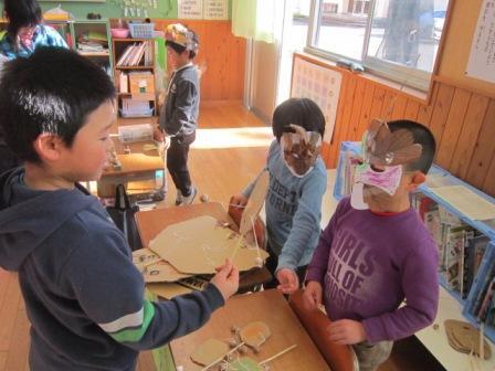 飾り物もあれば、コマやでんでん太鼓、けん玉の遊び道具、帽子など、たくさんの種類が並びました。1枚1000ドングリのお札を使って買い物をします。売る方も買う方も大盛り上がりでした。