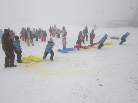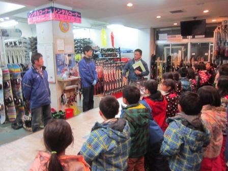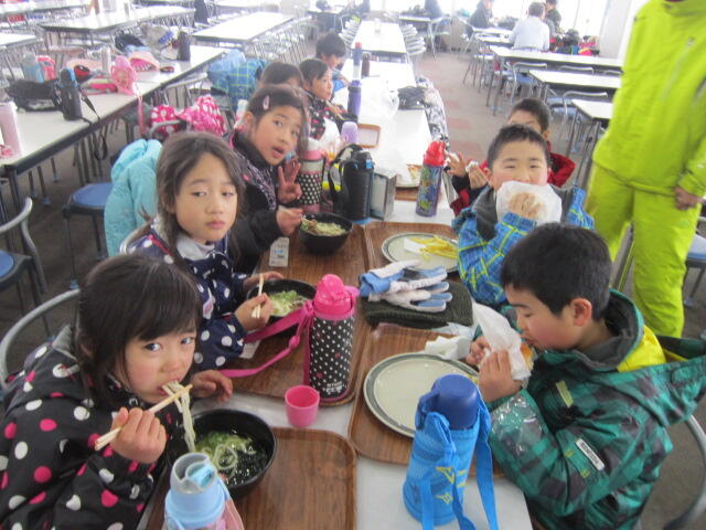 スキー場は、雪交じりのやや強い風が吹くあいにくの天気でしたが、子どもたちは、元気にそり遊びをしました。お昼休みは、自分で食券を買って食事をしました。大人と同じ量でしたが、楽しい雰囲気で食べたせいか、みんな完食でした。その後は、スキー場の方に施設の説明などしてもらいました。このような経験ができるのも五ヶ瀬ならではです。鞍岡の子どもたちは幸せです。
