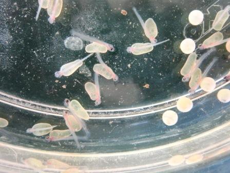 12月4日に2年生が、ヤマメの里に見学に行きました。その時に、ヤマメのたまごをいただきました。水温が上がりすぎないように気を付ければ孵化しますよとのことで、川の水をくみに行って大切に見守ってきました。10日ほど経って孵化し始め、今ではほとんどが孵化しました。まだ大きな袋を付けて重たそうですが、元気に動き回っています。この袋が取れてしまって、魚の姿になると、育てていくのが難しいそうで、しばらくしたら川に戻してあげたいと思います。夏に塩焼きにして食べたヤマメのたまごから、また新たな生命が育つ姿を目の当たりにして、子どもたちは、命の大切さを学ぶことができたのではないでしょうか。