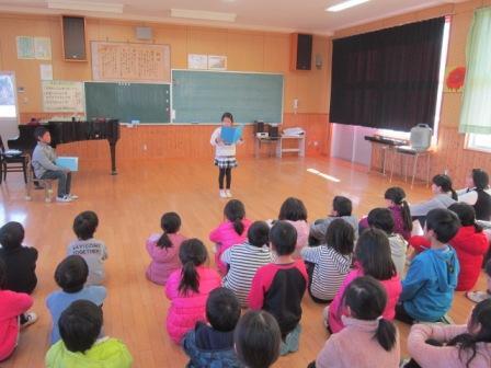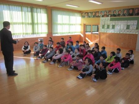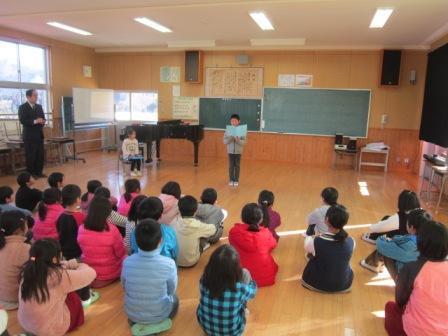 まず、1年生と3年生の代表児童が、2学期を振り返った作文を読んでくれました。上履き洗いが自分でできるようになった、駅伝大会で一生懸命がんばったと、二人とも大きな成長を遂げたことがよくわかるような元気で立派な発表でした。