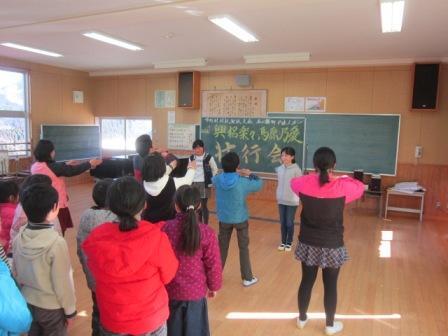 終業式の後には、年明けの市町村対抗駅伝に五ヶ瀬町代表として出場する、2人の児童の壮行会が行われました。鞍岡小から2人も代表に選ばれるとはとても素晴らしいことです。運動会の応援団長2人を含めた6年生のかけ声の下、全校児童から大きなエールがおくられました。その後に、二人が力強い意気込みを聞かせてくれました。鞍岡小みんなの応援を受けて、自分の力を出し切ってがんばってくれることと思います。