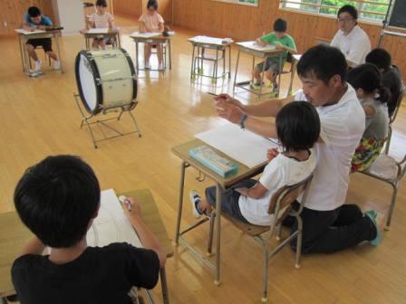6月29日(金) 3年生以上が図工の時間絵画について外部の講師から教えていただきました。講師は、五ヶ瀬町の方で、美術を専門に勉強されているおたすけ隊の方です。3・4年生は、デッサンの仕方、5・6年生は、風景画の描き方を勉強しました。影の付け方や構図の取り方など、専門家ならではのわかりやすい説明で、子どもたちの絵も2時間の間にみるみる上達していくのがわかりました。子どもは、きっかけさえあれば無限の可能性を発揮できることを再確認できました。