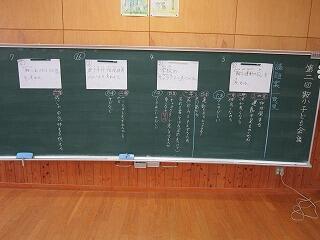 今朝は、全校朝会の後に「第2回鞍小子ども会議」の議題決めを行いました。今回は、5年生が、計画委員会の役目と進行をつとめます。全校のみんなが議題箱に入れてくれたたくさんの議題の中から、4つの議題に絞り込み、その中から一つを決める話合いでした。各学年が推す議題とその理由が述べられ、それを元に話合いが進みました。6年生は、さすがと思えるような前向きな意見を述べ、4年生は、他の案との関連しながら自分の案を推していました。1・2年生も、自分たちの考えをしっかり言うことができ、第1回目からすると格段の成長が見られました。話合いの結果、「ろうかや階段使用のルールを決めよう」に決まりました。各学級で内容についての話合いがもたれ、本会議に臨むことになります。