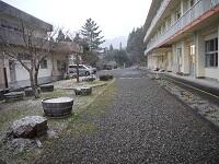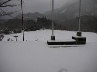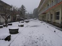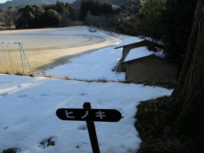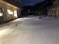 さて、学校の周りを見てみましょう。太陽の当たる運動場や玄関には、さすがに雪はありません。しかし、…。