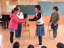 2月12日(水)6年生から下級生への引継ぎ式が音楽室で行われました。6年生3名が下級生へ思いを伝え、5年生から6年生へ感謝の言葉が贈られ、現指揮者の6年生からから新指揮者の5年生へ指揮棒の受け渡しがありました。新しい鼓笛隊のスタートです。