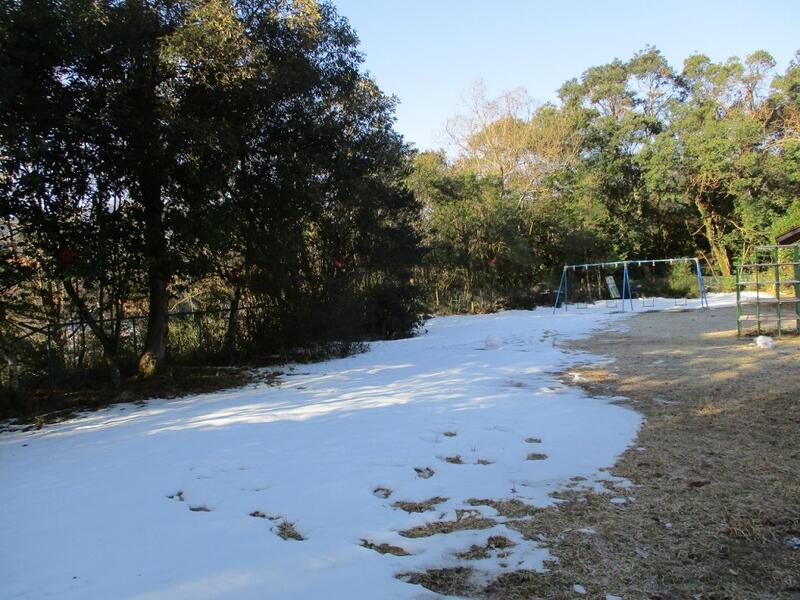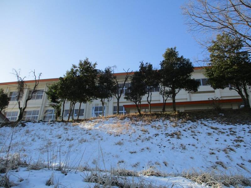 さて、学校の周りを見てみましょう。太陽の当たる運動場や玄関には、さすがに雪はありません。しかし、…。