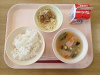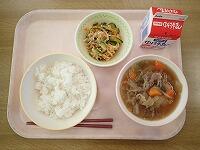 麦ごはん 牛乳 高千穂牛肉じゃが 千切り大根のアーモンド和え