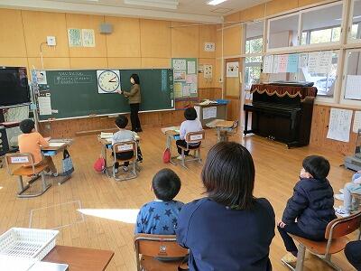 2月6日(火) 新入学児童保護者説明会を行いました。来年度、鞍岡小学校に入学を予定している4名のお友達が、1年生の時計の授業を参観しました。「小学校って、どんなことをするんだろう?」と興味津々のまなざしで、先生や1年生の様子を見つめていました。