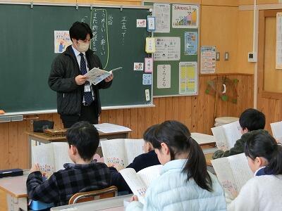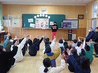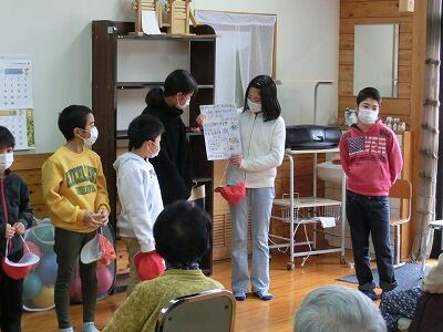 2月7日(水) 1年生、2年生、5年生、6年生が鞍楽を訪れ、地域の高齢者の方々に、鞍楽で行われる予定の学習発表会(2月17日)、お別れ遠足(3月1日)について、PRを行いました。高齢者の皆さんは子ども達から受け取った手作りのチラシを、嬉しそうに見てくださっていました。当日はたくさんの方々と交流するのを子ども達も楽しみにしています。