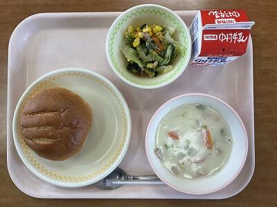 米粉パン クリームシチュー ほうれん草のコーンのサラダ