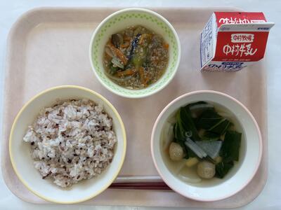十二穀ごはん あじのつみれ汁 なすのそぼろ炒め 牛乳