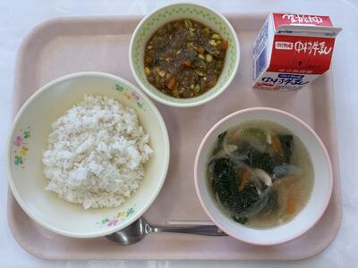 麦ごはん 鶏肉とえびのフォー 厚揚げのカレーそぼろ煮 牛乳