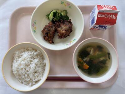 麦ごはん 吉野汁 錦揚げ きゅうりの塩もみ 牛乳