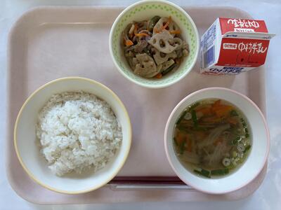 麦ごはん 沢煮椀 れんこんきんぴら 牛乳