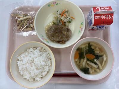 麦ごはん 白玉だんご汁 和風ハンバーグ 和え物 かりんとう 牛乳
