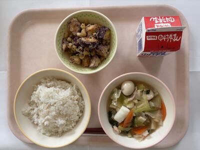 麦ごはん 厚揚げの中華煮 かふう和え 牛乳