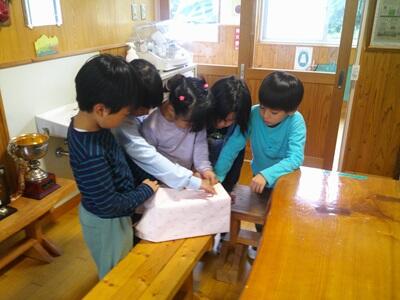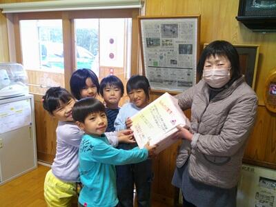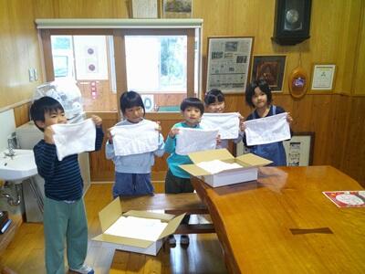 10月31日(金)町内にある事業所「NicoRon」の皆さん手作りのぞうきんを寄贈していただきました。代表して1年生が受け取り、「ありがとうございます。おそうじがんばります。」と一人一人がお礼の言葉を伝えてくれました。