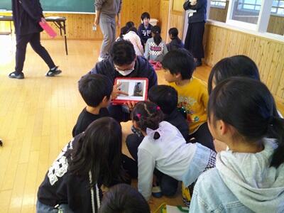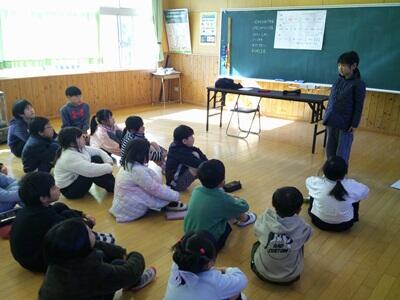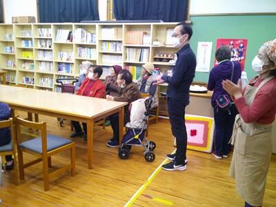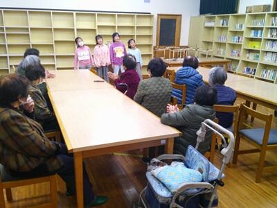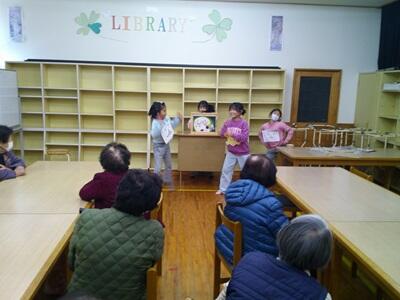 11月26日(水)先日の「鞍小子ども会議」で、地域の方々に感謝の気持ちを伝えるために自分たちにできることを話し合いました。そのうちの1つが「読み聞かせ」です。この日、子どもたち4名が、毎週水曜日に地域の高齢者の方々が集まっている「祇園テラス鞍楽(くらら)」を訪問し、紙芝居や劇による読み聞かせをしたり、校歌を歌ったりしました。この読み聞かせや校歌を聞いた高齢者の方々は、大変喜んでくださいました。